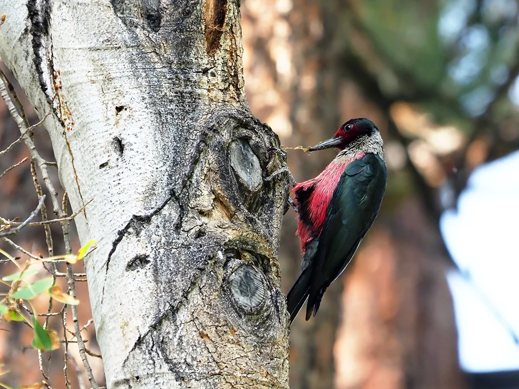 An adult Lewis’s Woodpecker preparing its insect prey for delivery to nestlings. This species spends most of its time feeding on aerial insects above the forest canopy. Then, it returns to an ‘anvil’ site to smash up the insects from multiple forays, making it easier for the nestlings to accept the food.